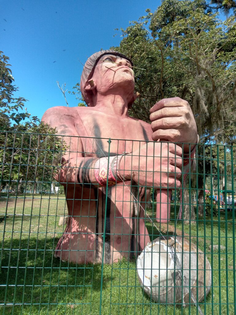 Foto junho/23 – Estátua de um índio Guarani, vê-se que está bem descuidada, Bertioga – SP