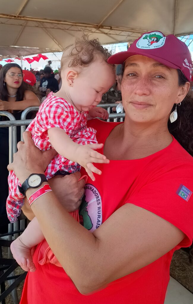 Kelen Katia da Cruz Oliveira, Agronoma 32 anos, mãe solo de uma filha ainda bebê . Está acampada no Quilomvo Campo Grande faz quatro anos,Está aguardando o programa Terra da Gente. O presidente Lula abraçou e beijou o seu bebê.