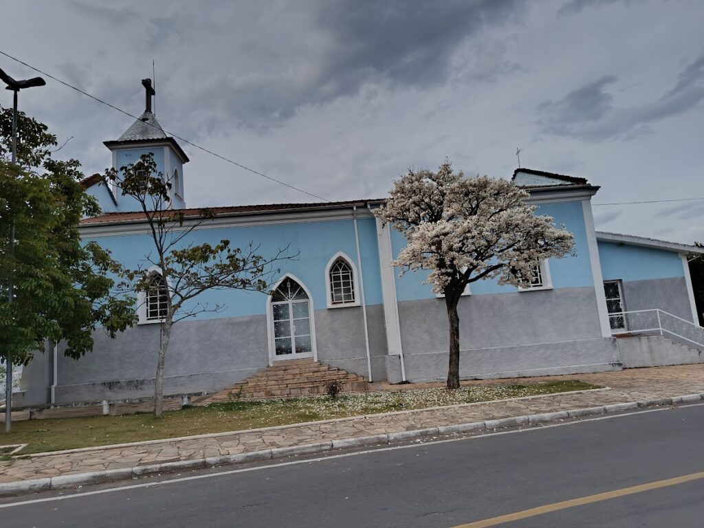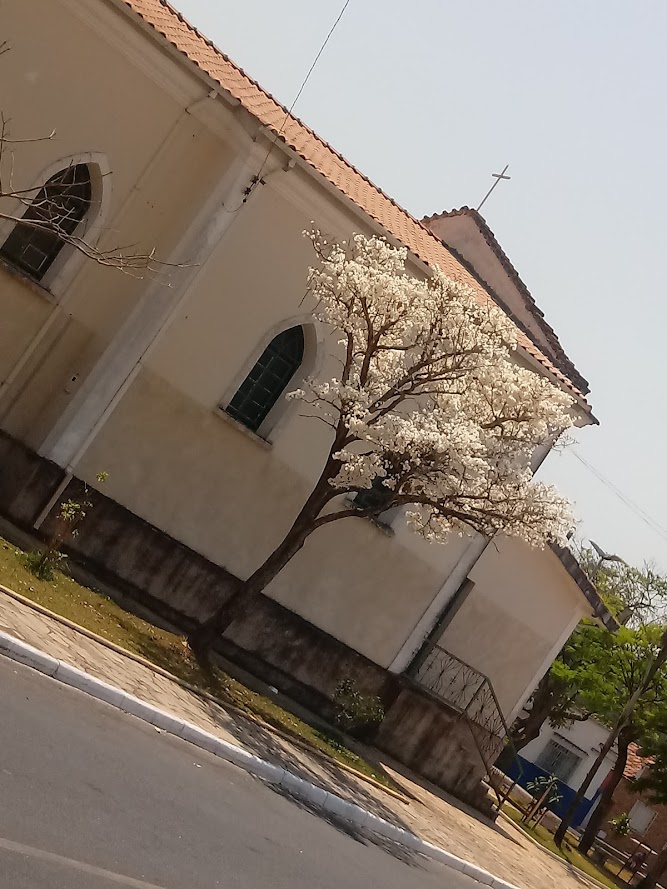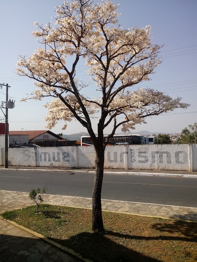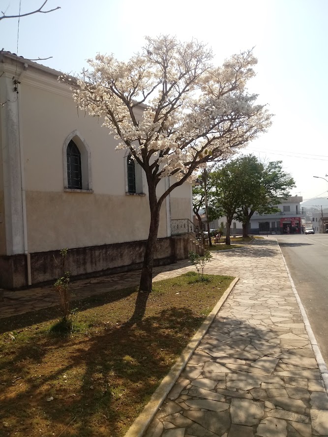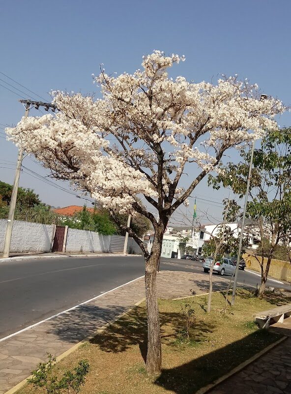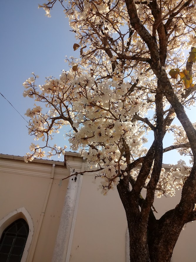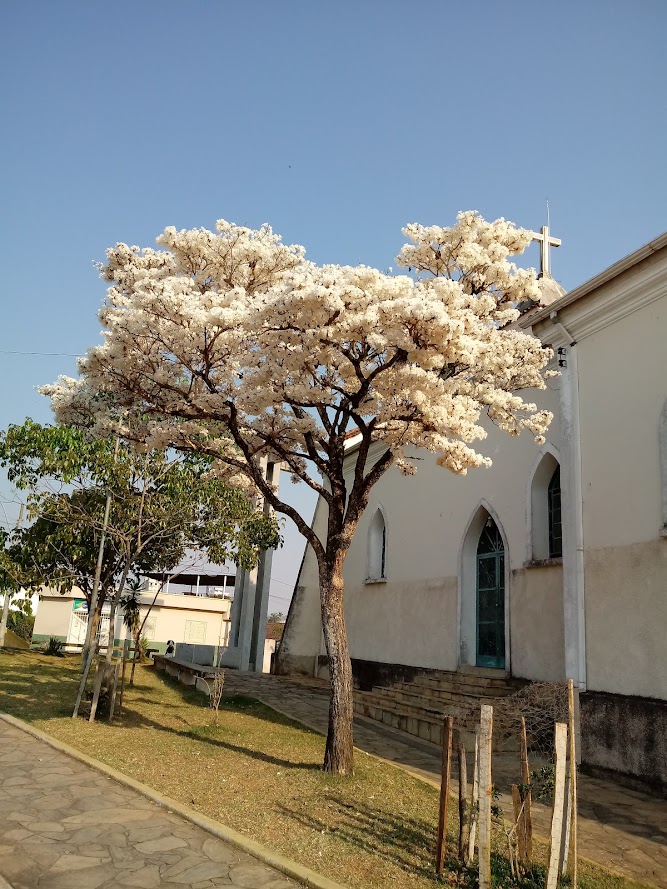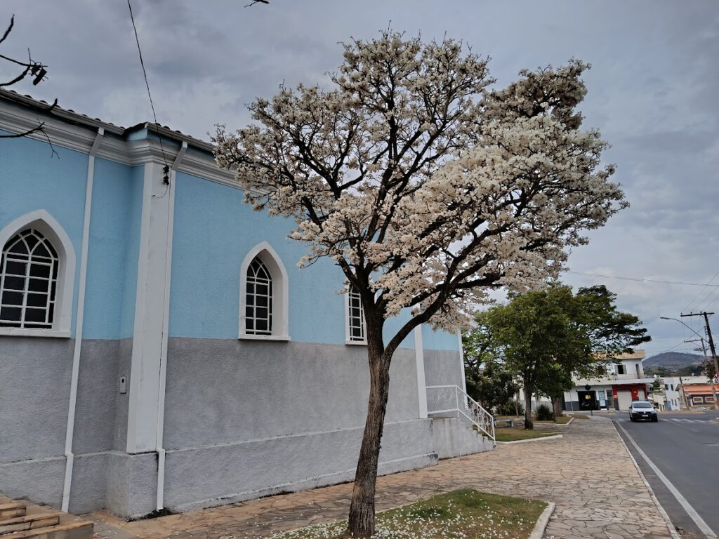 Esse pé de ipê branco dá um toque de destaque na Praça do Cruzeiro e se junta ao paisagismo da Igreja Nossa Senhora Aparecida.