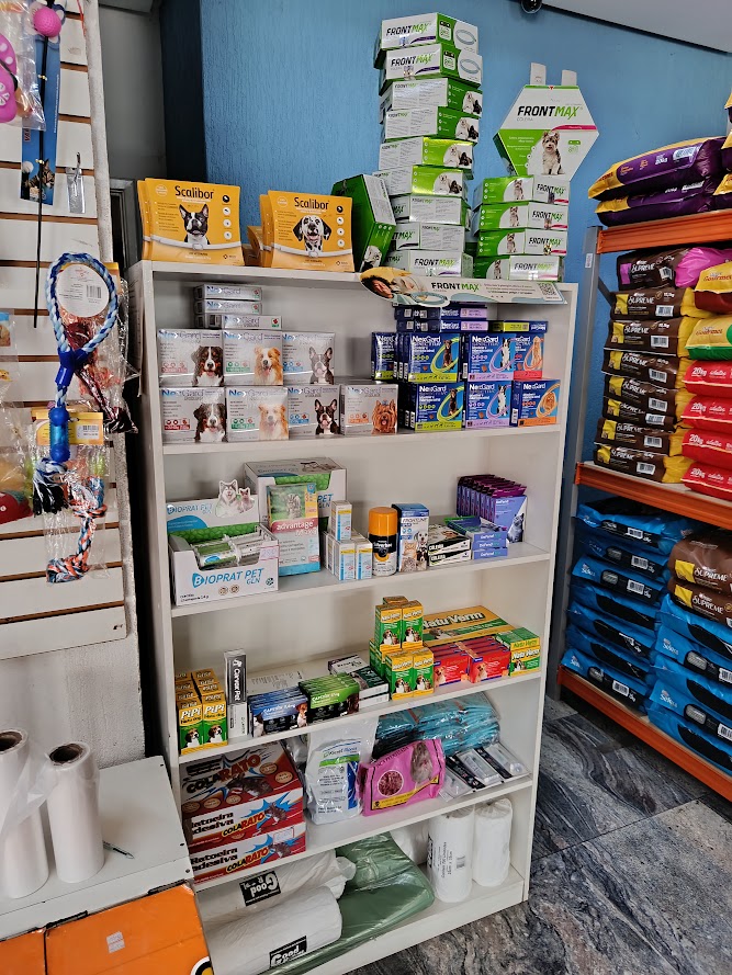 Brinquedos (bolas, cordas, mordedores, brinquedos interativos). Acessórios (coleiras, guias, peitorais, caminhas, casinhas, bebedouros, comedouros). Produtos de higiene (shampoos, condicionadores, sabonetes, tapetes higiênicos, escovas, cortadores de unha). Medicamentos e suplementos (vermífugos, antipulgas/carrapatos, vitaminas).