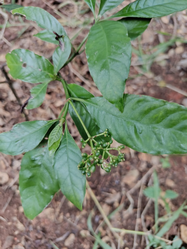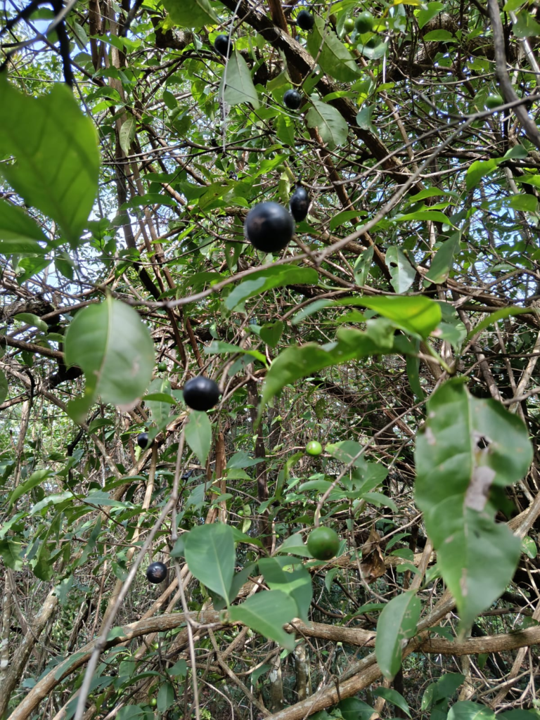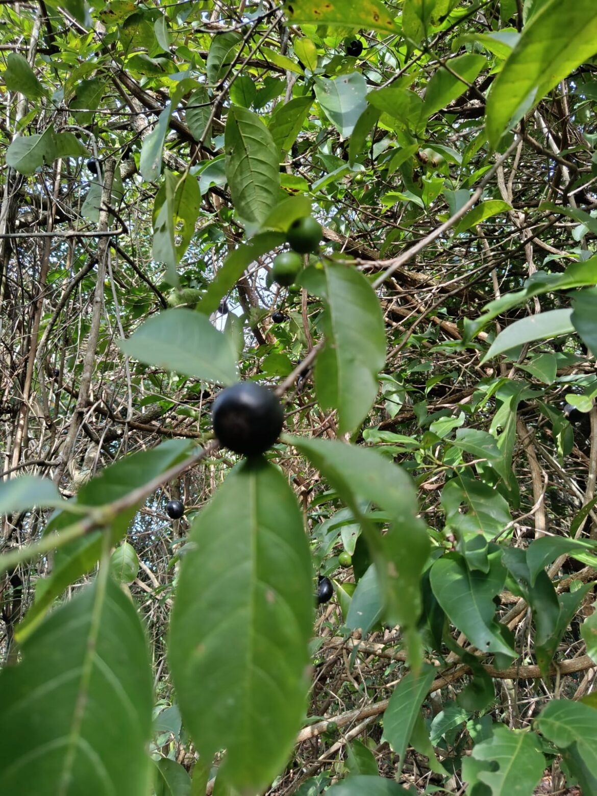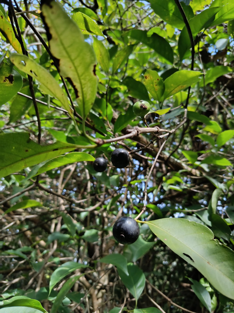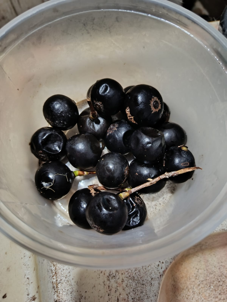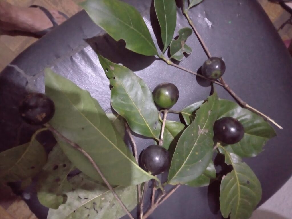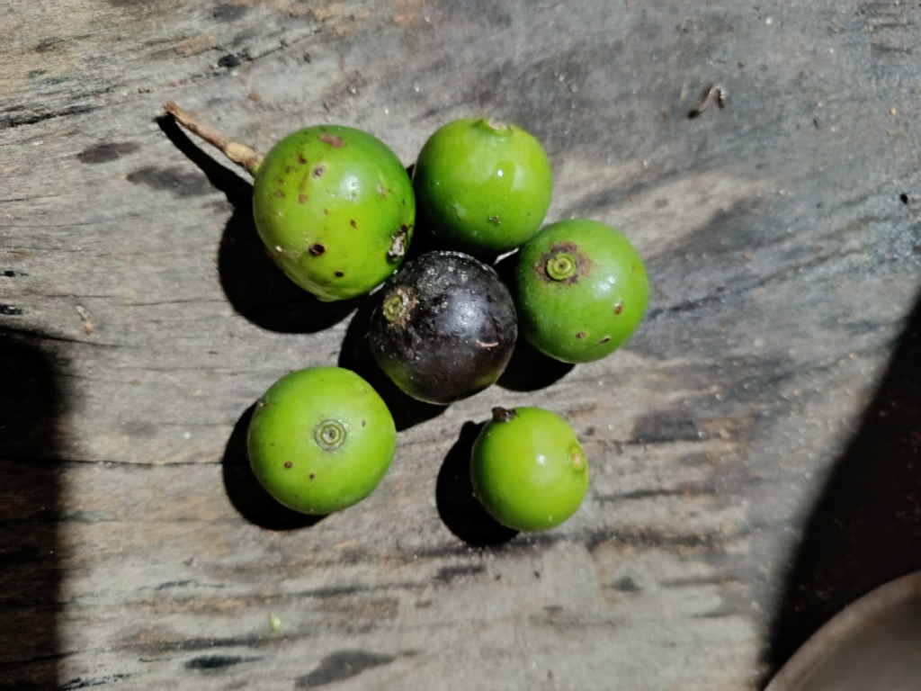 O fruto aparece no fim do ano, entre novembro e dezembro. É redondinho, parece uma maçã pequena. Quando tá maduro, fica pretinho e perfuma o terreiro.