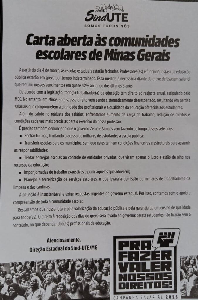 Segundo o Sind-UTE/MG, a luta vai além do salário. A campanha salarial também defende melhores condições de trabalho, respeito aos direitos dos profissionais e mais investimento na educação pública.